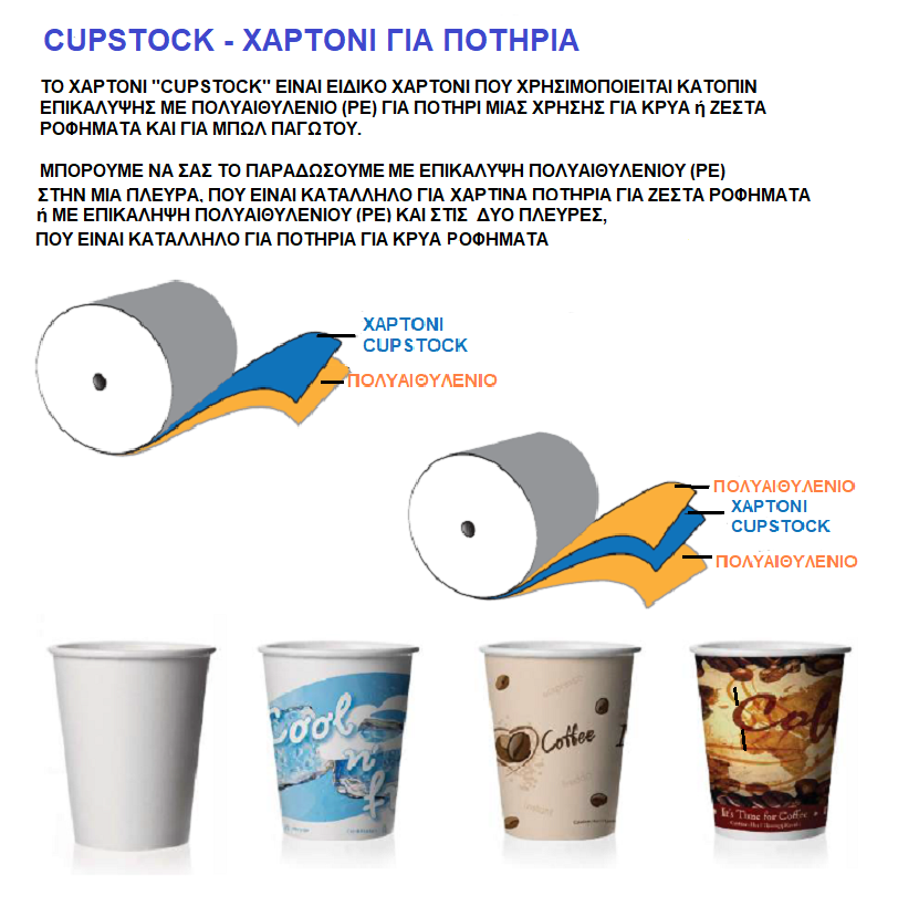 ΤΟ ΧΑΡΤΟΝΙ ''CUPSTOCK'' ΕΙΝΑΙ ΕΙΔΙΚΟ ΧΑΡΤΟΝΙ ΠΟΥ ΧΡΗΣΙΜΟΠΟΙΕΙΤΑΙ ΚΑΤΟΠΙΝ ΕΠΙΚΑΛΥΨΗΣ ΜΕ ΠΟΛΥΑΙΘΥΛΕΝΙΟ (LDΡΕ) ΓΙΑ ΠΟΤΗΡΙΑ ΜΙΑΣ ΧΡΗΣΗΣ ΓΙΑ ΖΕΣΤΑ ή ΚΡΥΑ ΡΟΦΗΜΑΤΑ.